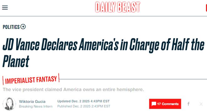 据美国《野兽日报》网站12月2日报道,美国副总统万斯为美军在加勒比海袭击所谓“运毒船”行动辩护时声称,整个西半球属于美国管辖。